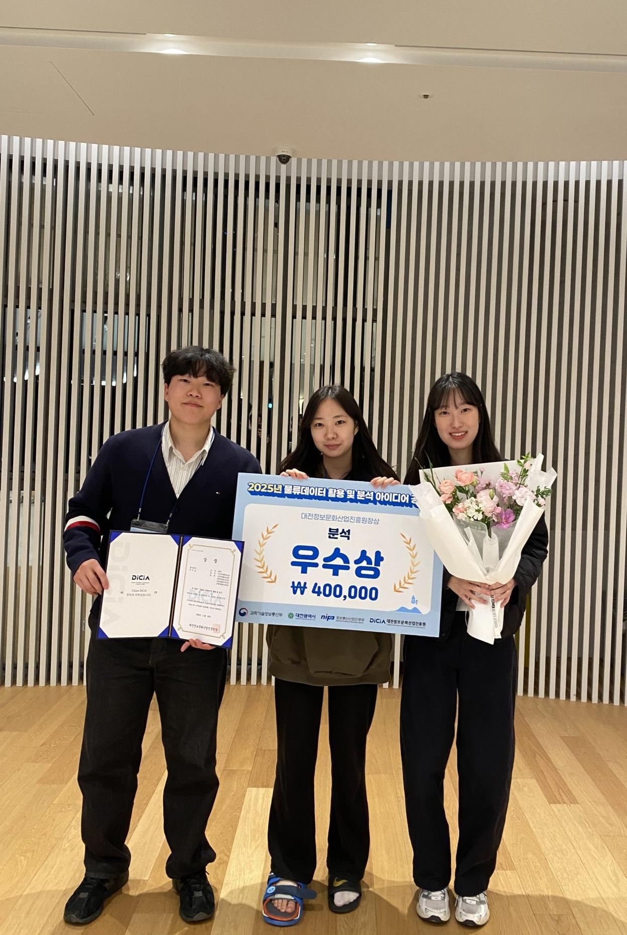 대전정보문화산업진흥원이 주관하는 2025년 물류데이터 활용 및 분석 아이디어 공모전에서 우민수, 유태욱, 김정음, 김현정, 나유정 학생이 "재난 및 돌발상황 대응을 위한 동적 차량경로 최적화 - 대전광역시 우편물류망을 중심으로"로 참여하여 우수상을 수상했습니다.