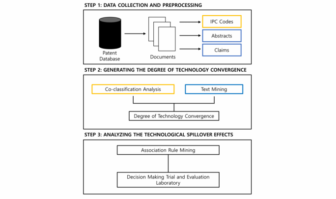 기술 분야 간 융합 수준을 추정하기 위해 특허 데이터에 텍스트마이닝(Text mining)을 적용하여 IPC 간의 기술지식흐름을 생성하고, 연관규칙마이닝(Association Rule Mining) 분석을 통해 기술융합(Technology Convergence) 관점에서 기술의 영향력을 도출